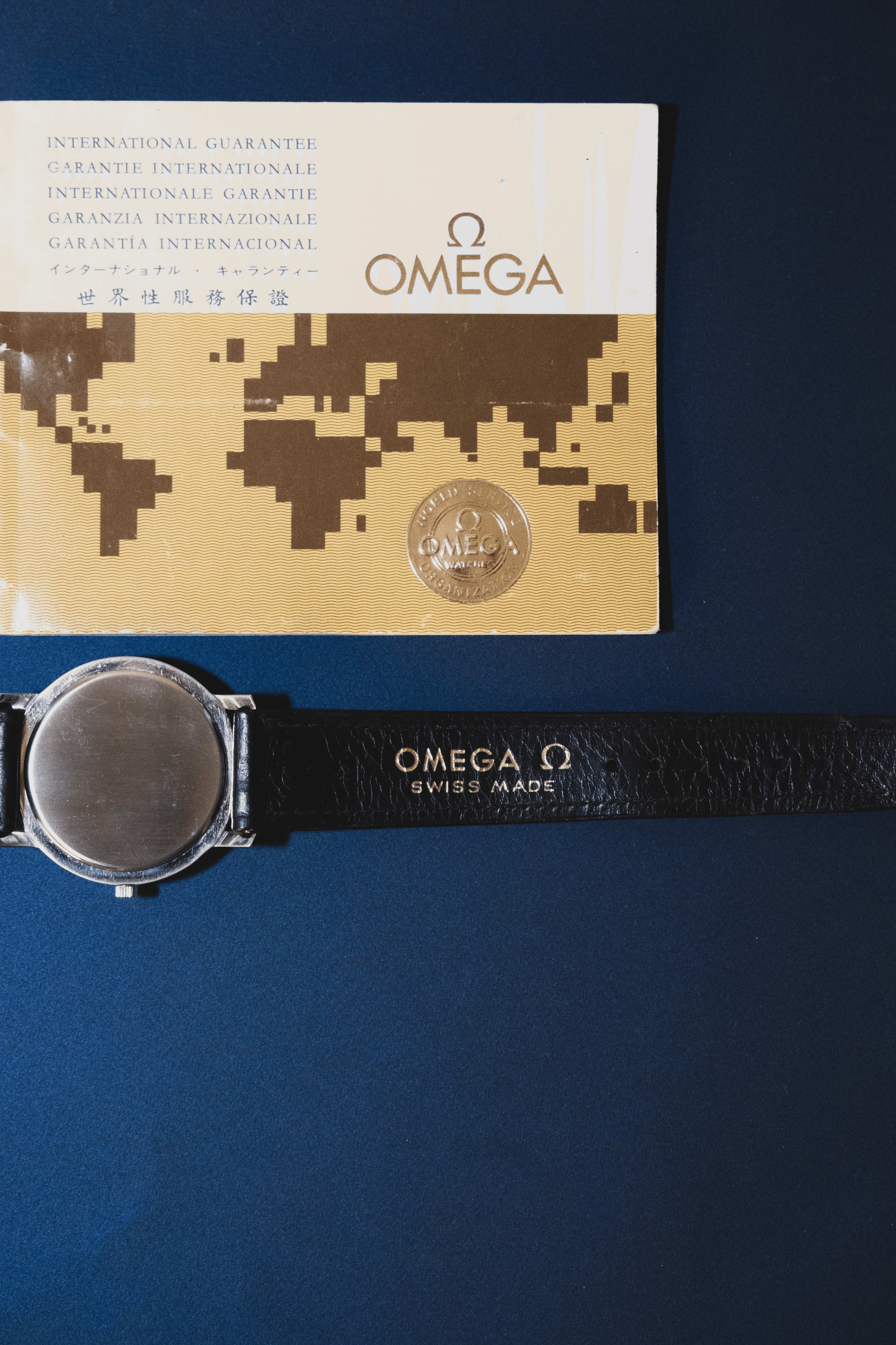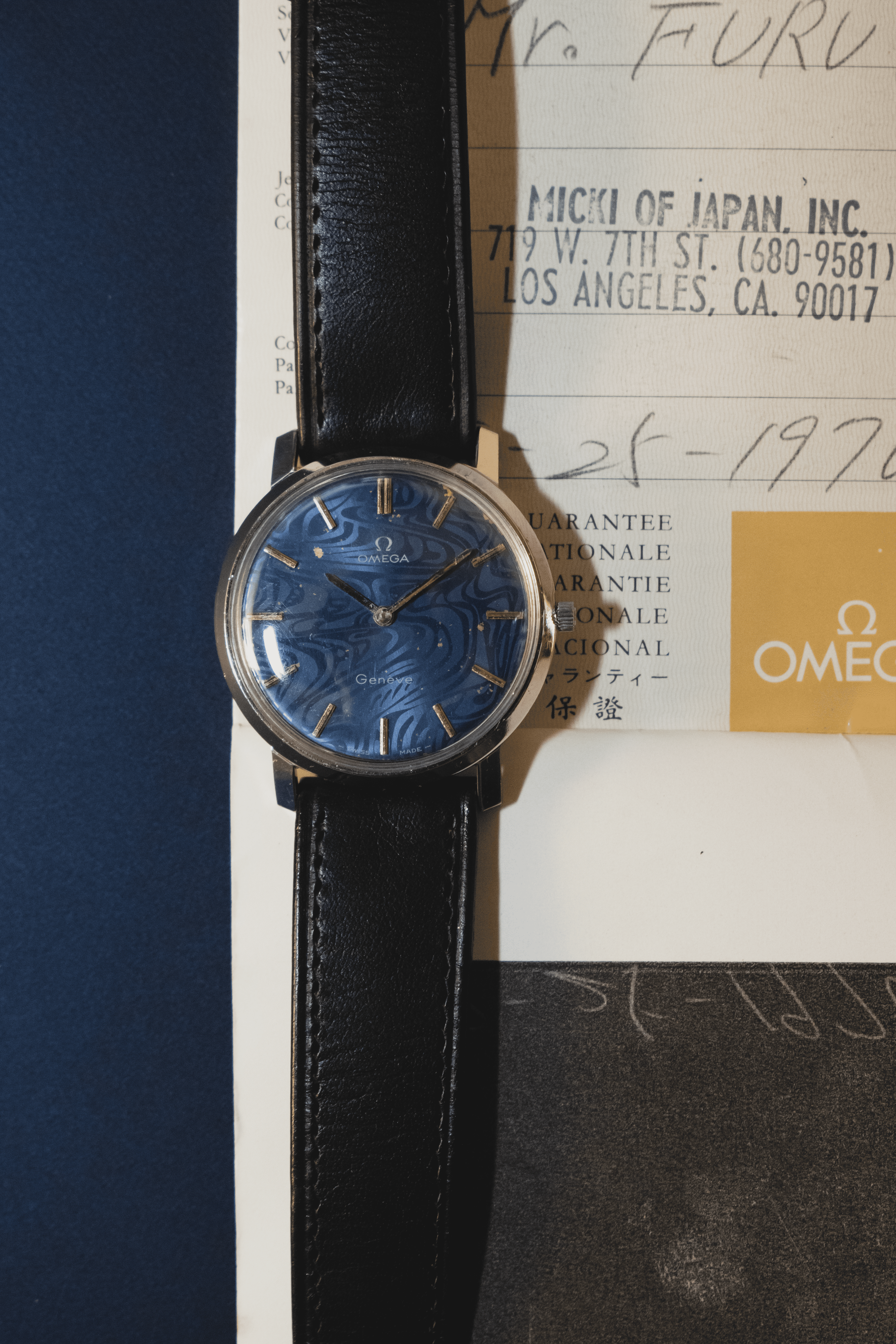 Omega Genève ST 111.0106, vendue en 1976, avec cadran bleu d’origine. Proposée en full set complet (boîte, papiers, bracelet et boucle Omega), en condition collector.